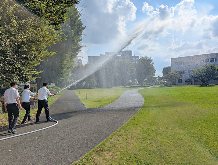 消火栓の使い方について業者より説明を受け、ホースを伸ばす等の手順、警報との連動について学び、実際の放水も行った。消火ホースは複数人で支えないと水の方向が定まらず、コントロールの難しさを体感することができ、とても貴重な経験となった。