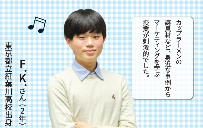 「ベーシック・マーケティング」の授業で、商品が持つ価値には「機能的・情緒的・社会的」という3つがあると学び、視点が一変。アルバイト先のスーパーで何気なく手にする商品についても「なぜこの価格設定なのか」「ターゲットは誰か」「この商品が提供している価値は」と、比較・分析するようになりました。また株取引シミュレーションを通して、為替や国内外の情勢が市場に影響することを実感。日常の買い物や実社会のビジネスそのものが学びの延長になっていると感じています。