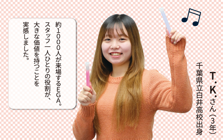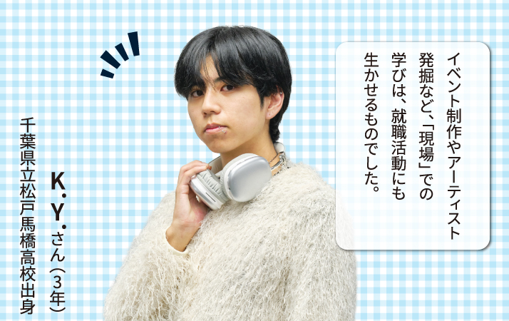 ライブは、音楽が「聴く」だけでなく「体験するもの」になり、アーティストとファンが共鳴する特別な時間。その現場を支える仕事に惹かれています。「江戸川ガールズアワード(EGA)」では舞台監督を務めました。全体の進行管理を担う責任の重さに不安もありましたが、仲間と協力しながらイベントを成功させることができ、大きな達成感を味わう経験に。また音楽ビジネスに関連する授業では、音楽レーベルの現場やマネジメントに携わるプロのお話を伺う機会もあり、とても刺激的でした。