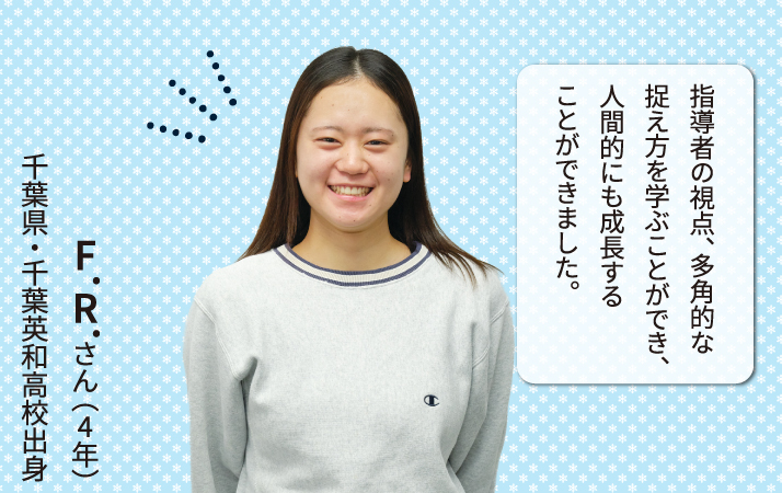 ケガの予防や身体のケア、メンタルがパフォーマンスに与える影響などを科学的な視点から学び、自分自身の選手としての経験も踏まえながら理解を深めることができました。学修内容は部活動に活用できるものも多く、学びを通して、チームに貢献する姿勢など、自分の価値観にも大きな変化がありました。卒業研究では、韓国大学バスケにおける男女格差について、現地選手へのインタビューも交えて調査。育成環境や特有の文化的価値観が競技レベルに与える影響を分析しました。