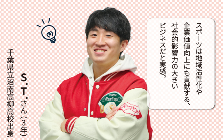 スポーツビジネスの現場を知る先生方からはもちろん、著名なスポーツ関係者や元選手の方々からも、実際の体験やスポーツに対する考え方などを伺う機会があり、とても刺激的でした。私自身もバレーボールをプレーする中で感じていたように、スポーツもビジネスも、チームとしてさまざまな連携があってこそ成り立ち、一人きりでは何もできないという点がおもしろいところだと思います。今後は、スポーツによる地域活動などについて学び、卒業研究に取り組んでいきたいと考えています。