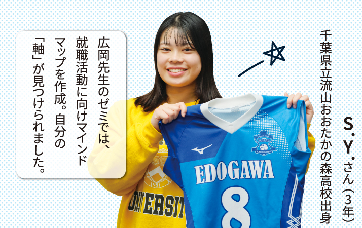 広岡先生のゼミでは、毎回の授業でゼミ生が注目したニュースやコラムの要約を行う取り組みを続けています。ものごとの本質を素早く捉える力が養われ、人前で話すことへの苦手意識がなくなって、就職活動の面接でも大きな力になりました。また「クラブ経営の収益構造」について扱った授業では、チケットやグッズ、放映権などの収入源について分析し、スポーツが単なる情熱だけでなく、緻密なビジネスモデルと地域連携によって成り立っていることに驚き、さらに興味を持ちました。
