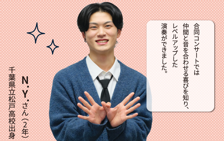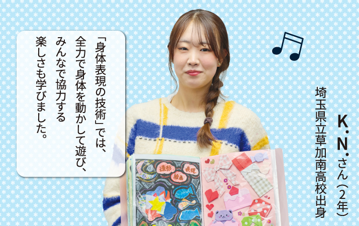 ピアノをしっかり練習するようになったのは、入学してから。最初は片手で弾くのがやっとでしたが、少人数制のていねいな指導を受け、両手で演奏したり、伴奏しながら子どもの歌を一緒に歌えるようになりました。個別に使えるレッスン室での練習も続けています。「声楽表現」の授業では、絵本の読み聞かせに歌を取り入れるグループワークに挑戦。登場するキャラクターの行動に合わせて、歌や音楽で抑揚をつけたり、情景を表現したりなど、物語の世界に引き込む表現を学びました。