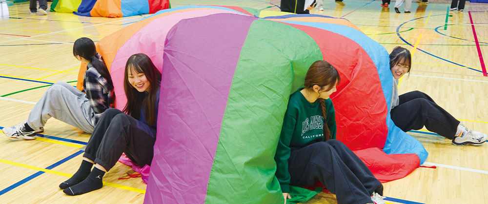 また2年次の科目「身体表現の技術」では、ボールや新聞紙などを使った遊び、ジェスチャーやダンス、創作演技を実践。子どもの心身の発達や運動機能についての理解を深め、身体を使った表現と、その指導方法について学びます。さらに3年次の「総合表現演習」ではICTの活用も含めた多媒体の表現活動を学び、指導案の作成にも取り組みます。