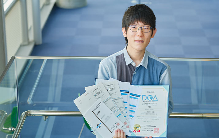 コンピュータや情報処理に関する基本的な知識をはじめ、プログラミングやシステム開発、ネットワーク、情報セキュリティなどについて学べる科目はもちろん、試験対策に役立つ科目で、情報関連資格取得へのサポートも充実。