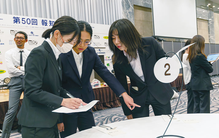 映画ファンの投票をもとにノミネート対象が選ばれる「報知映画賞」。歴史ある同賞の趣旨に賛同し、2024年度・2025年度に協賛しました。学生は表彰式の業務を経験する貴重な機会も。25年には『国宝』で監督賞を受賞した李相日監督への花束贈呈を担いました。