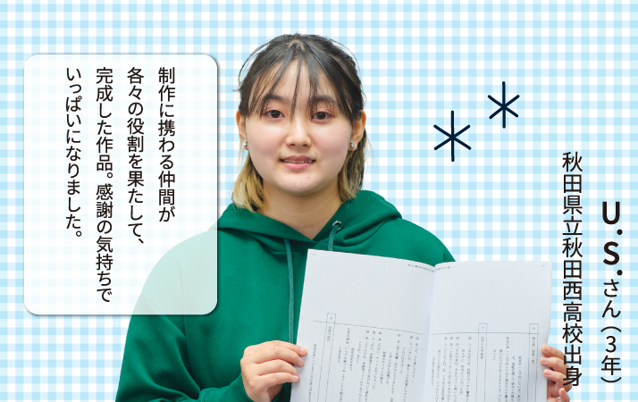 小久保先生の演習・実習で、CM制作の監督を担当。企画から撮影、編集と進めながら、頭の中のイメージを映像としてどうつなげるか、その難しさに直面しました。先生のアドバイスを受けながら完成させた作品を観た時、自分たちが見ていた景色が「映像作品」として生まれ変わったことに強い感動と達成感を覚えました。専門ゼミでは、プロデューサーとしてチームをまとめる役割も経験。「作品は決して一人ではつくれない」という事実と、仲間とつくり上げる喜びを、身をもって学んでいます。