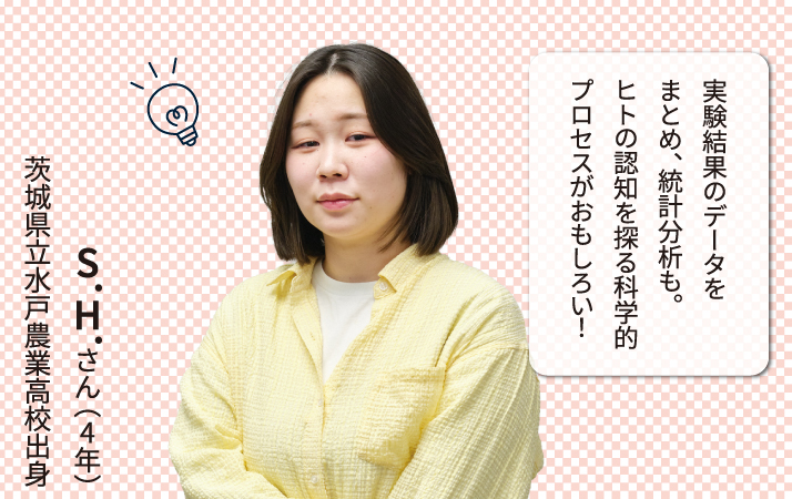 もともと興味を持っていた心の動きが、「注意」という心の機能の一部だと知ったのは1年次の「知覚・認知心理学」でのこと。4年間を通じて、学びのテーマになりました。難易度や複雑さが異なる心理実験に参加する中で、幅広い実験課題(方法)に触れ、人の心理を数値化して分析する楽しさを味わいました。