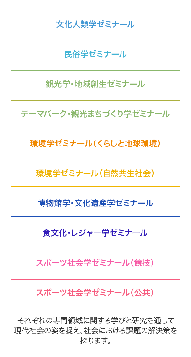 現代社会論、現代社会とライフデザイン、現代社会とフィールドスタディ、社会調査法I・II、フィールドワーク論で基礎を学び、現代社会の見方を学びます。
