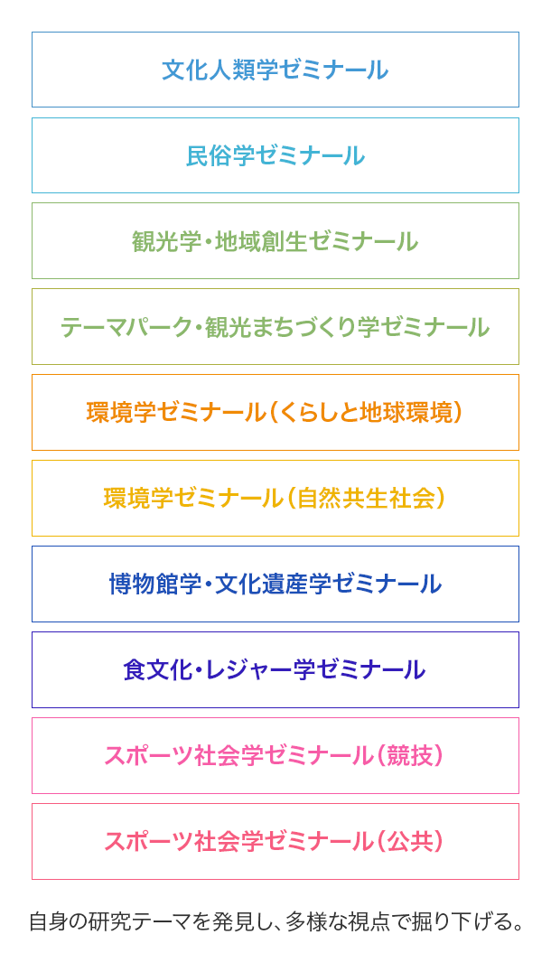 各研究領域の専門知識を身につけながら、専門ゼミナールや実習でフィールドワークを実践して自身の研究テーマを探ります。