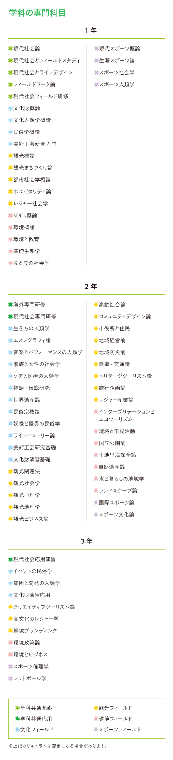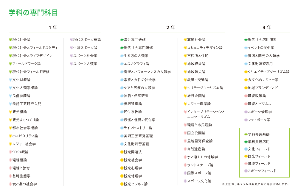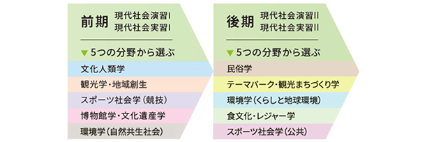 「文化」「観光」「環境」「スポーツ」の4つのフィールドから現代社会を学び、フィールドワークを通して、