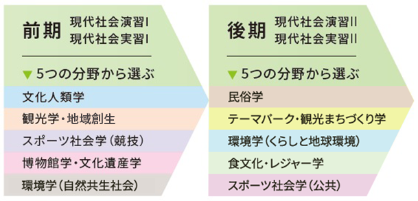 現代社会演習I・II・実習I・IIで、フィールドワークの理論と技術を修得する。専門科目を興味・関心に応じて履修し、3年次のゼミナール(専門領域)の選択に向けて、各分野への理解を深めます。