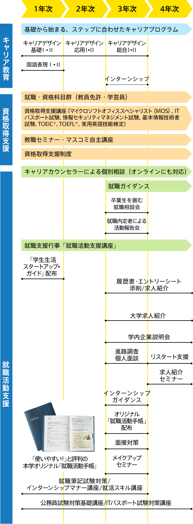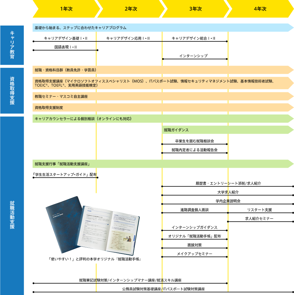 1年次から「学生生活スタートアップ・ガイド」の配布やインターンシップマナー講座、公務員試験対策基礎講座などがあり、3年次には「就職活動手帳」の配布やSPI模擬テスト、面接対策などの講座を行っています。