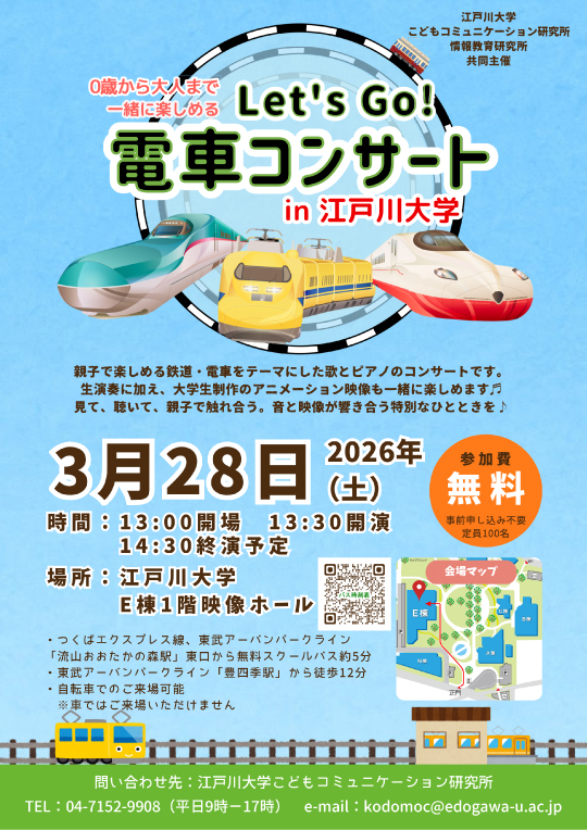 今年度は、情報教育研究所と共同主催で親子で楽しめる鉄道・電車をテーマにした歌とピアノのコンサートを開催予定です。