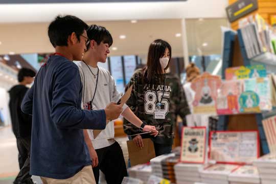 「こども教材開発論」の授業の一環として、3年生が参加してブックハンティングを実施し、紀伊國屋書店流山おおたかの森店にて200冊余りの専門図書を選書しました。今回は参加人数が多く、10数人ずつの班を3つ、3回に分けて行いました。参加者の皆さんが熱心に本棚を眺めながら、お目当ての本をリストアップしていたのが印象的でした。