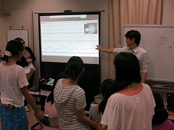 休憩を挟んで、脳波・眼電図の測定実習を行いました。目の動きや覚醒状態と、記録された波形との関連について、参加者自らが被験者となって体験しながら学びました。また、それと同時にスタッフの大学生1名に睡眠ポリグラフ計測用の電極を装着し睡眠実験室内で睡眠をとらせ、実際に記録を見ながら睡眠状態の変化について説明しました。