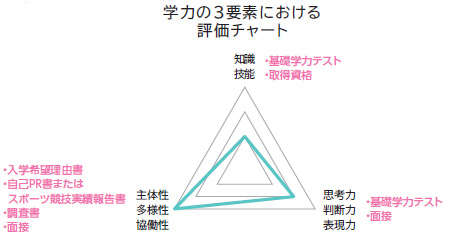 入学希望理由書、自己PR書またはスポーツ競技実績報告書、調査書、面接による評価