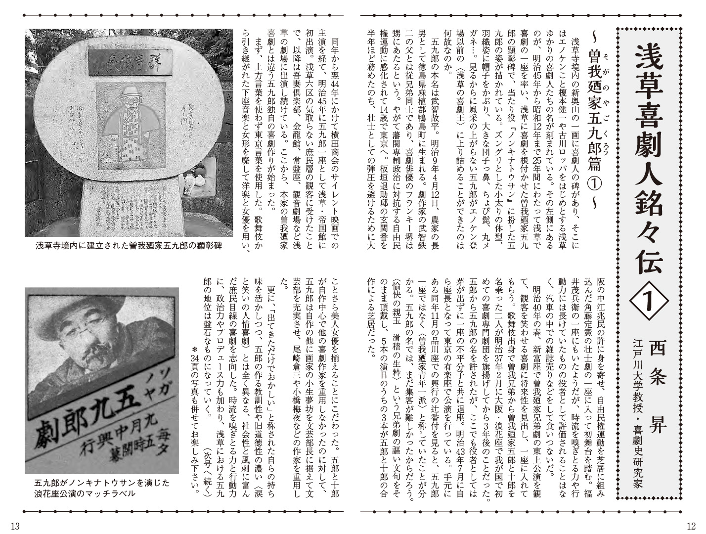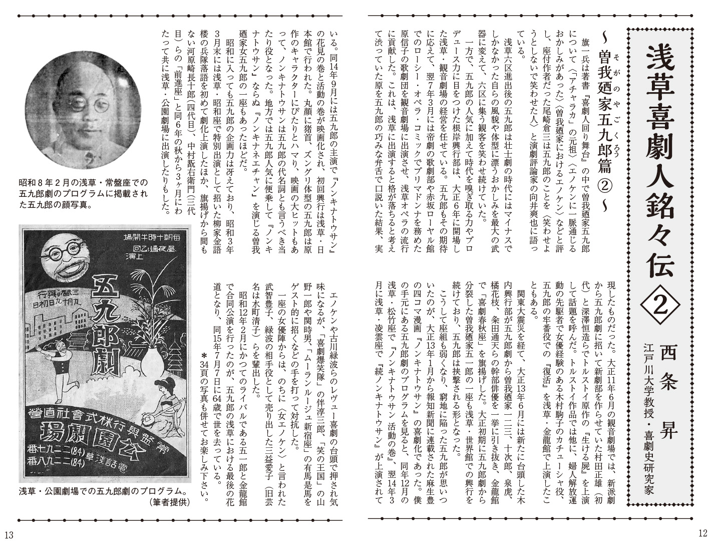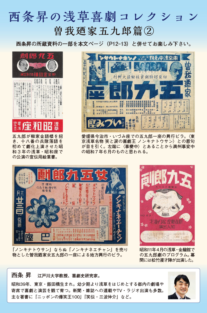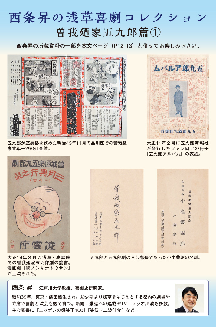 「浅草喜劇人銘々伝」では、毎回、浅草ゆかりの喜劇人にスポットを当て、浅草喜劇史における功績、芸風、人となりなどを紹介。「西条昇の浅草喜劇コレクション」では、「浅草喜劇人銘々伝」で取り上げた喜劇人に関する西条教授の所蔵資料4〜5点をカラーで掲載します。