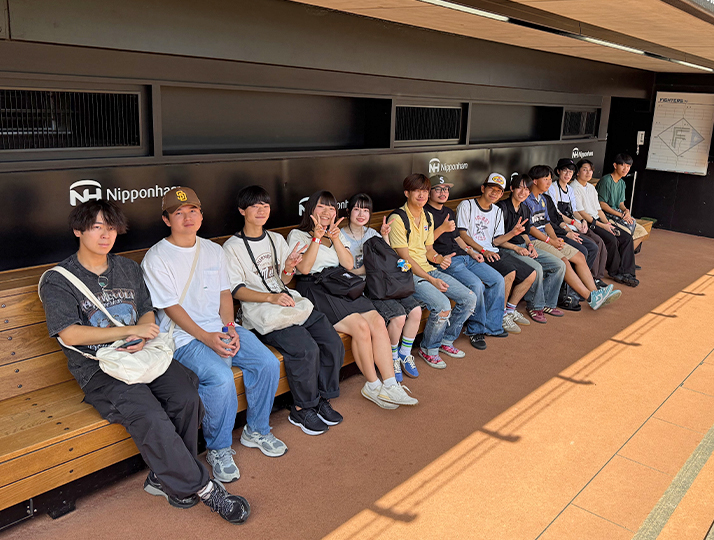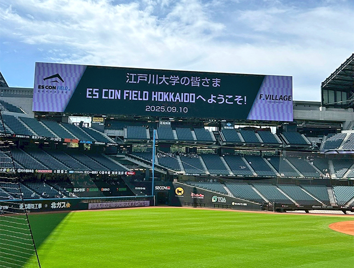 「スポーツとまちづくり」をテーマに、札幌市周辺にあるスポーツ施設を視察するフィールドワークを実施しました。北海道ボールパークFビレッジでは、エスコンフィールドでのプロ野球の試合を観戦し、観客を楽しませる多様な設備や多彩な演出を体感しました。また、試合のない時のスタジアム内の施設を利用したり、周辺施設を日常的に活用したりする様子を見学したことで、Fビレッジが日常的な空間と非日常的な空間の両面を創出し、その結果、地域の活性化につながっている点を感じ取ることができました。