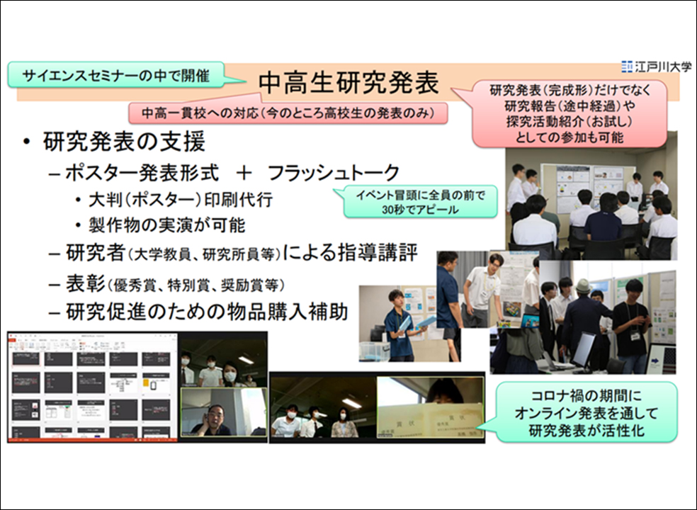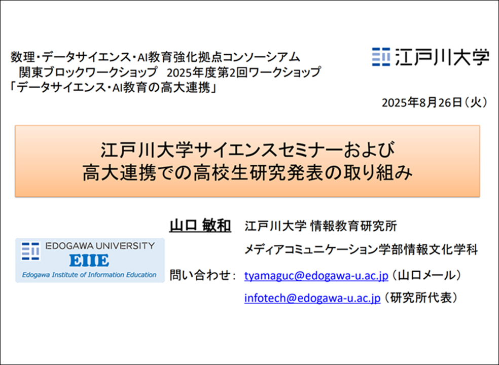 8月26日(火)にオンラインで開催された、関東ブロック2025年度第2回ワークショップ「データサイエンス・AI教育の高大連携」では、山口敏和准教授が「江戸川大学サイエンスセミナーおよび高大連携での高校生研究発表の取り組み」について発表を行いました。