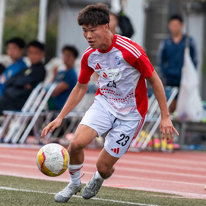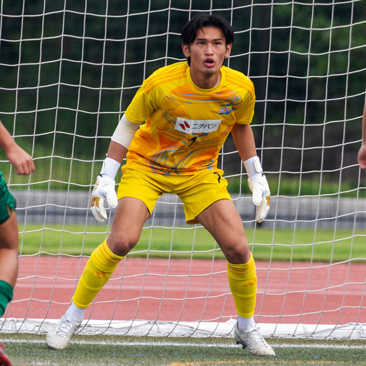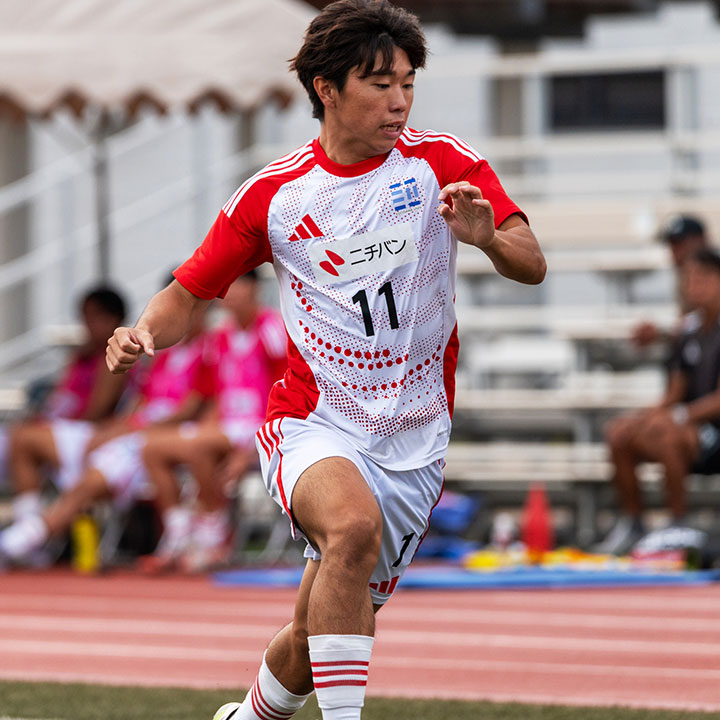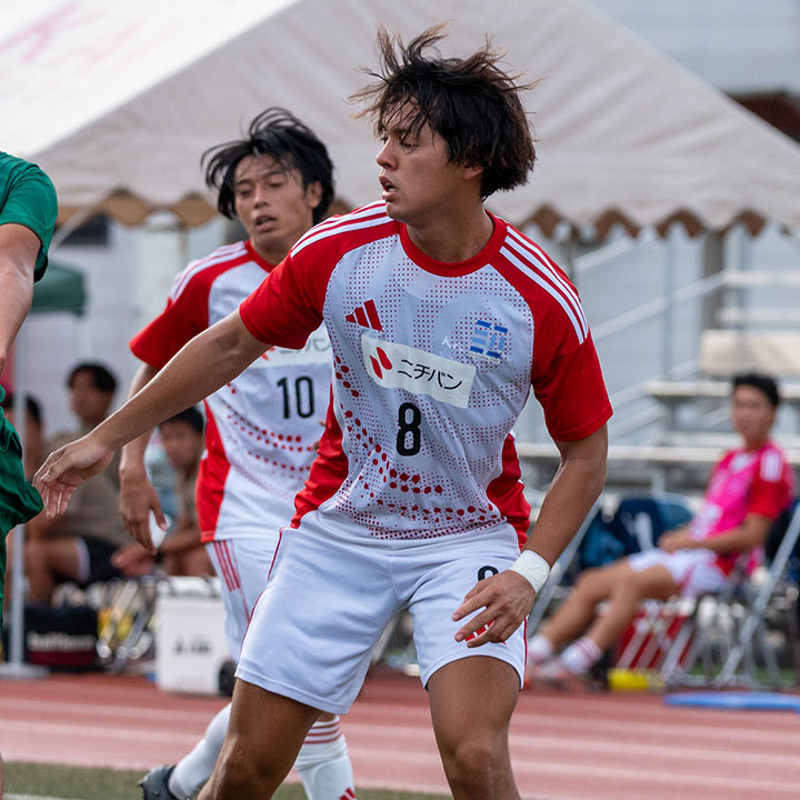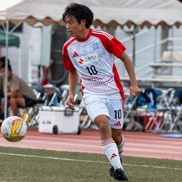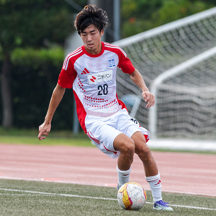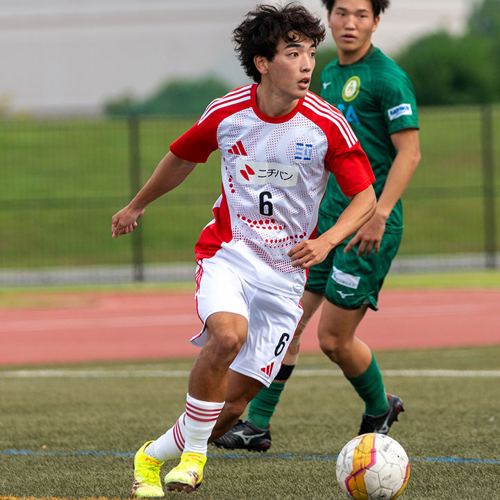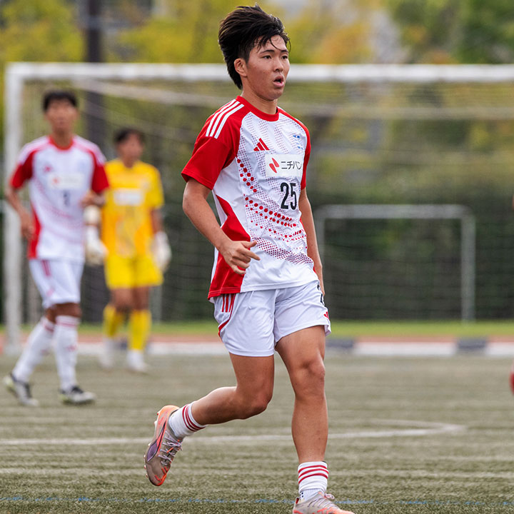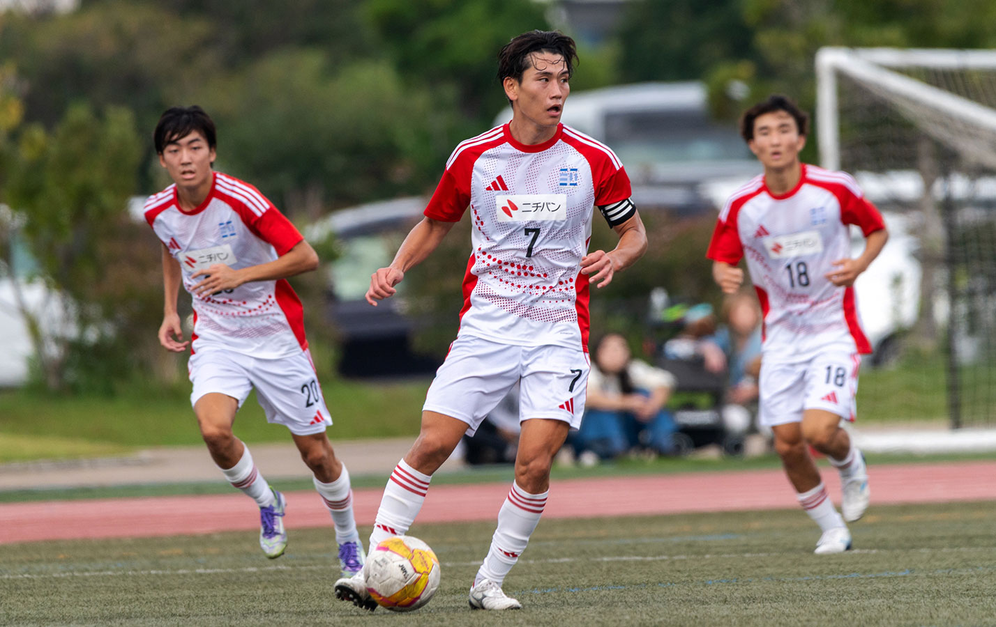 その後は落ち着きを取り戻し、前線からプレッシャーをかけながら反撃に出ました。菊池季汐(経営社会学科4年・札幌東豊高/北海道コンサドーレ札幌U-18)がシュートを放ち、安達朔(経営社会学科1年・札幌西陵高/北海道コンサドーレ札幌U-18)と宮原浩都(経営社会学科1年・鹿児島高)のコンビネーションからもチャンスをつくりましたが、得点には至らず前半を終えました。