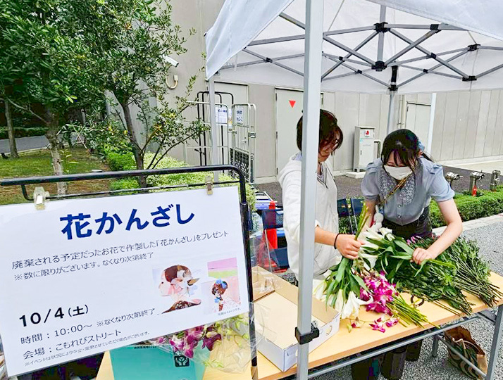 「花のテーマパーク~こもれび~」は、株式会社HANATSUMIが主催する、花をテーマにしたふれあいイベントです。市場に出せず廃棄されてしまう、開花しすぎた花や形の不ぞろいな花、茎の短い花などを活用し、花の新たな価値を発信しています。