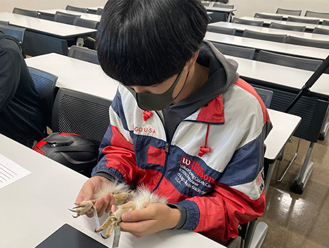 「我孫子市 鳥の博物館」は、手賀沼の下沼北岸に位置し、鳥類を中心に約4000点の資料を収蔵・展示する博物館です。講義では、博物館の4機能に即した同館の活動、我孫子市が実施している市民スタッフ制度と同館の取り組み(野外活動スタッフ、展示交流スタッフ、大学生スタッフ)について紹介がありました。また、展示交流スタッフが解説の際に使用している部分標本をご持参いただき、学生達が実際に標本に触れつつ鳥類の特性について学ぶことができました。さらに、ボランティアが持つべき心構えやコミュニケーションの重要性など、同館の活動を基にわかりやすく具体的に解説いただきました。