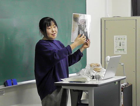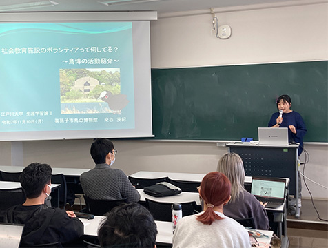 メディアコミュニケーション学部こどもコミュニケーション学科の中島金太郎講師(専門分野:博物館学史、歴史考古学)が担当する「生涯学習論II」において、11月10日(月)、「我孫子市 鳥の博物館(千葉県)」学芸員・染谷実紀氏を講師に迎え、特別講義「社会教育施設のボランティアって何してる?~鳥博の活動紹介~」を実施しました。