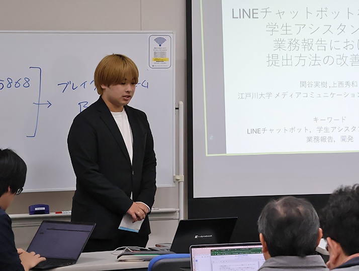 この研究会で、橋爪里一さんが「画像生成AIを活用した英語学習支援システムの開発 ~語順整序問題に着目して~」、関谷実樹さんが「学生アシスタントの業務報告提出を支援するLINEチャットボットの設計と実装」と題し、それぞれの卒業研究の内容を発表しました。質疑では、各分野の専門家と活発な議論が行われました。