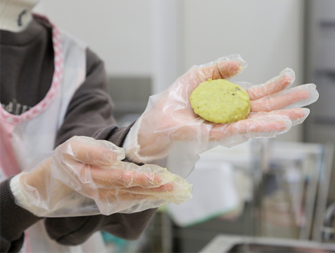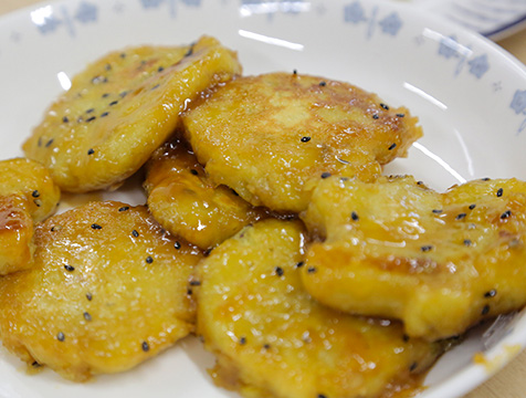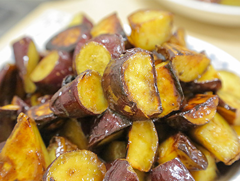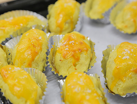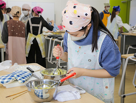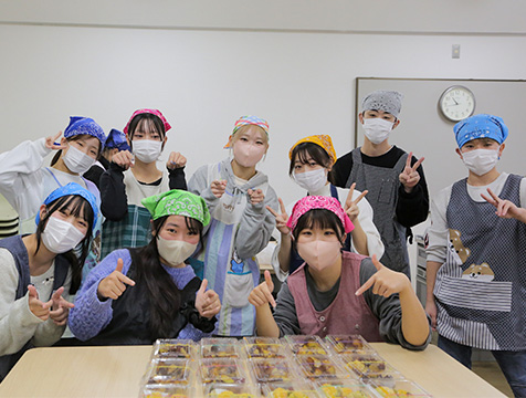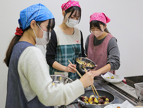 学生達はゼミごとに分かれて「スイートポテト」「大学芋」「サツマイモもち」に挑戦。サツマイモの下処理から調理、仕上げまで協力して作業を進め、おいしいサツマイモ料理を完成させました。