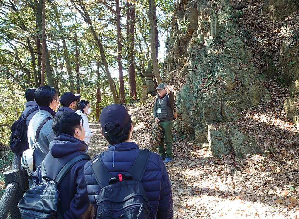 今回のエコツアーは「飯能市エコツーリズム市民ガイドの会」の協力を得て、午前・午後の2回に分けて実施されました。午前の部では「里山を歩こう!」と題したツアーに参加し、天覧山周辺を歩きながら、里山の自然環境や土地利用の歴史、現在抱えている課題について解説をいただきました。能仁寺や十六羅漢など、自然と信仰・暮らしが密接に関わってきた地域資源を実際に巡ることで、里山が人々の生活とともに形成されてきたことを体感的に学びました。