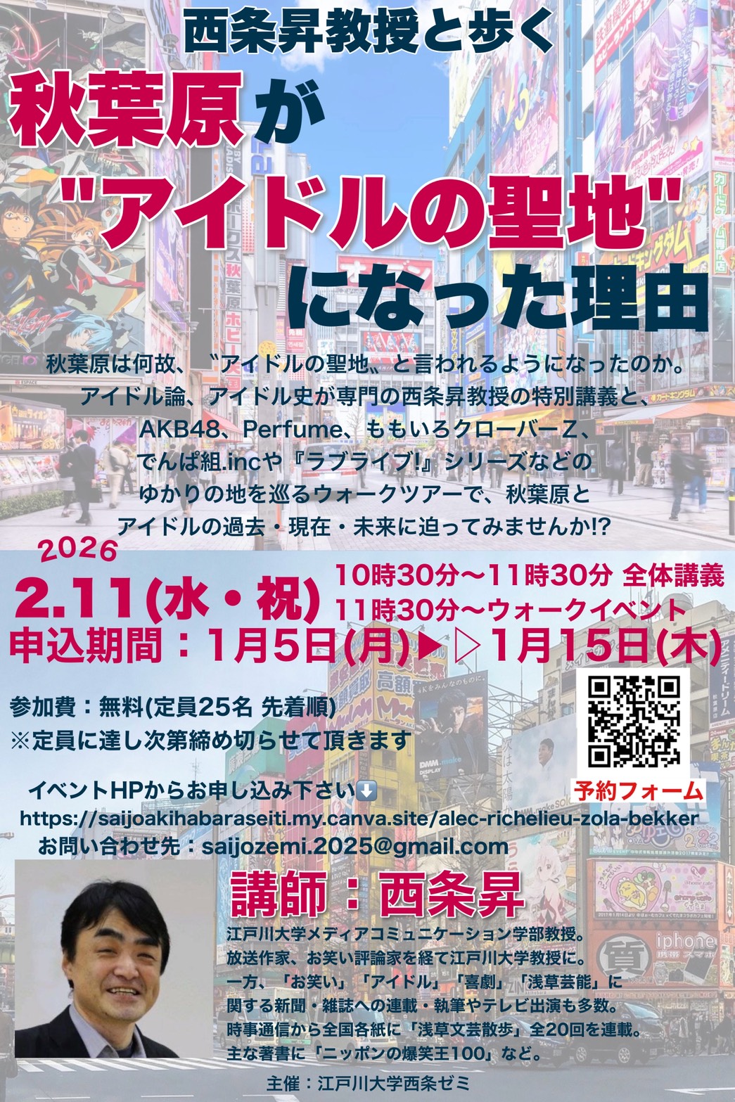 メディアコミュニケーション学部マス・コミュニケーション学科の西条昇ゼミ(エンターテインメントコース)は、2月11日(水・祝)に『西条昇教授と歩く 秋葉原が〝アイドルの聖地〟になった理由』と題し、特別講義とウォークツアーを開催します。