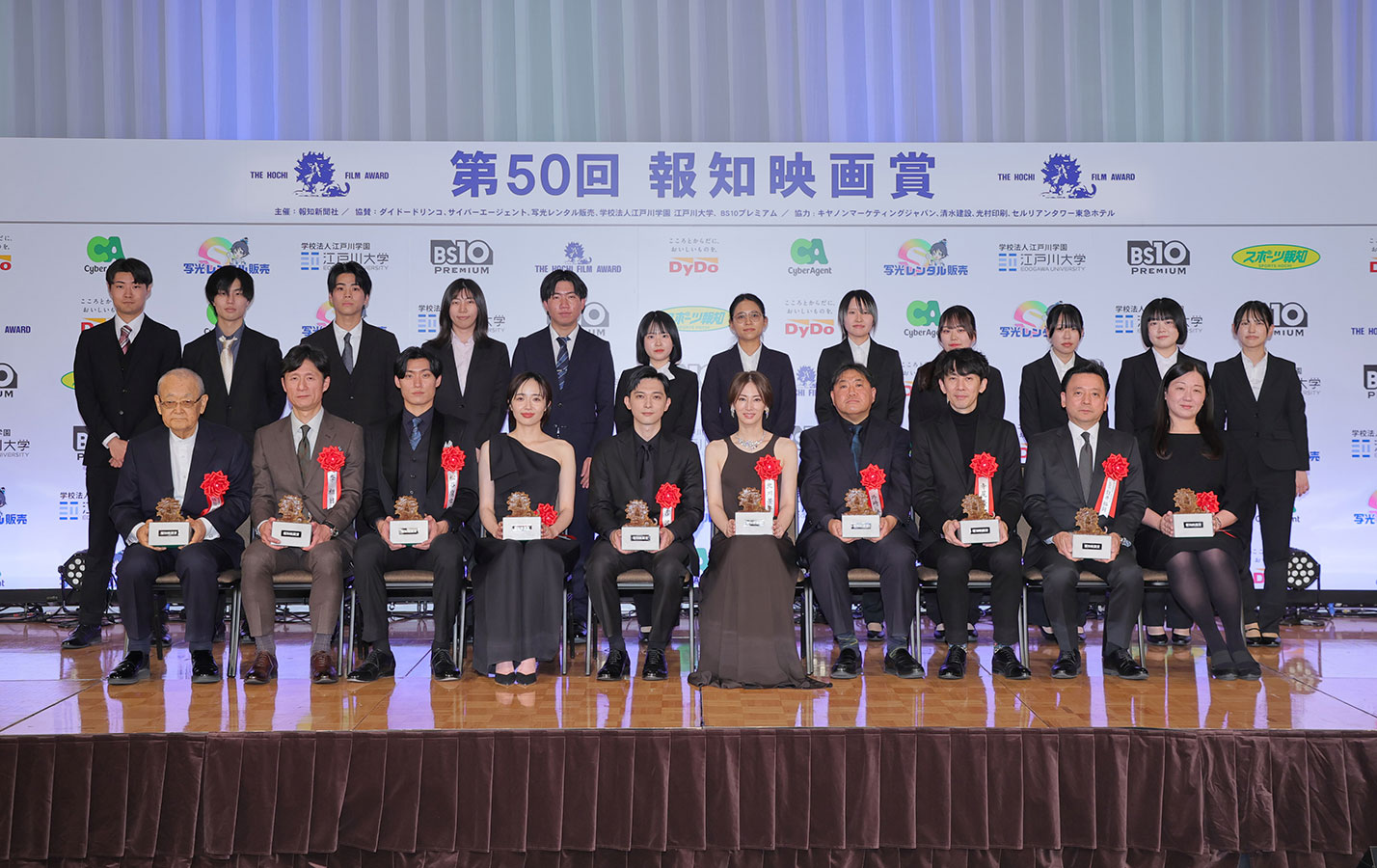 第50回報知映画賞授賞者と当日運営に参加したマスコミ学科学生(後列)メディアコミュニケーション学部マス・コミュニケーション学科の学生12人が、12月15日(月)に行われた第50回報知映画賞表彰式の運営に参加しました。