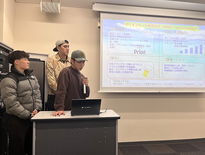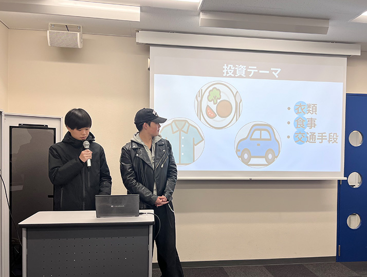 前期に行った個人ベースでの模擬株式投資の経験をいかし、後期はチーム単位で株式ファンドの組成を行いました。大学生の衣・食・住を重視した「大学生活必需ファンド」(ディフェンシブ型)と、余暇や長期休暇を重視した「大学生活充実ファンド」(オフェンシブ型)の2つのファンドを組成し、それぞれ消費者視点から企業の良い点、強み、特徴だけでなく、トランプ政策による影響や円安などを考慮し、今後の展望を示しました。