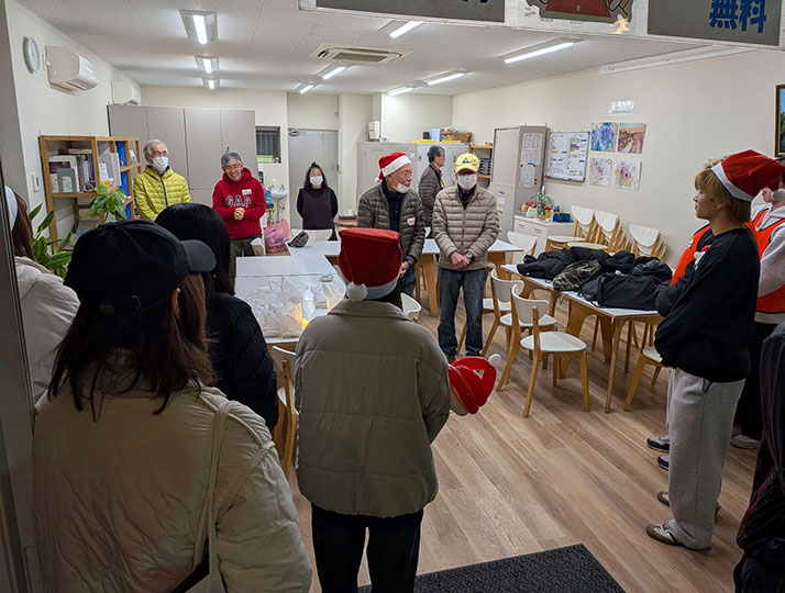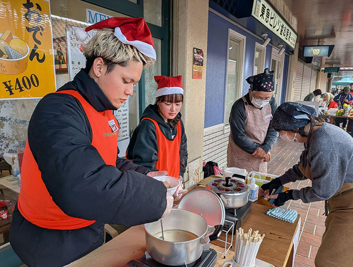 当日、ボランティアとして参加した学生たちはサンタクロースに扮し、子どもたちが遊びを楽しめるようにサポートしたほか、やきそばやおでんの調理補助、会場設営、来場者対応などを担当しました。世代を超えたさまざまな人々との協働作業を通じて、子育て支援に関する実践的な経験を積む機会となりました。