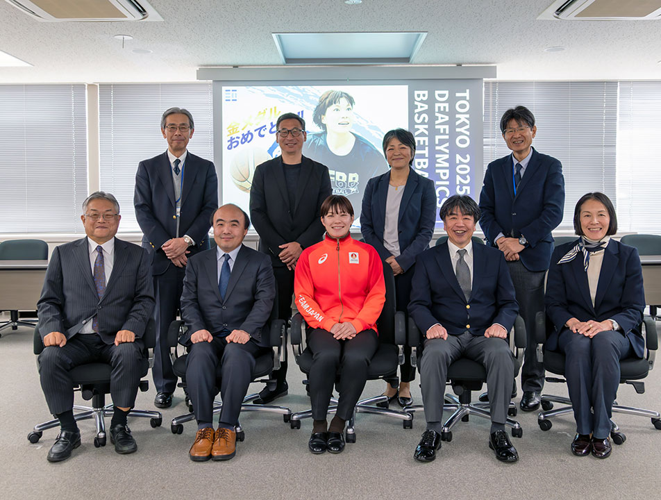 「東京2025デフリンピック」女子バスケットボール競技で、日本女子代表として史上初の金メダルを獲得した江戸川大学の卒業生・若松優津さん(2018年卒・メディアコミュニケーション学部こどもコミュニケーション学科)を、1月21日(水)に江戸川大学駒木キャンパスにお招きし、木内英仁理事長をはじめとする大学関係者に大会の優勝を報告していただきました。