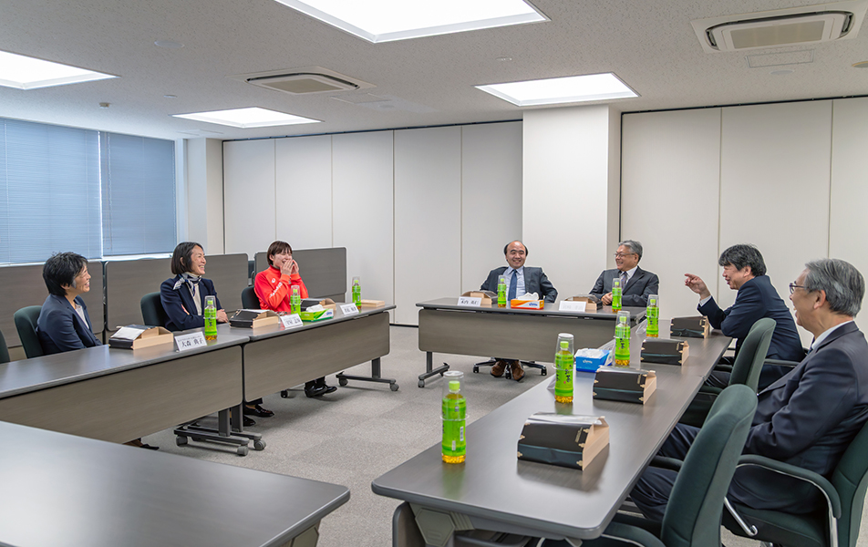 当日は、アスレティックデパートメント局長の広岡勲副学長、同局次長の鈴木秀生教授も懇談の輪に加わり、終始和やかで笑顔の絶えない報告会となりました。