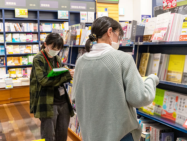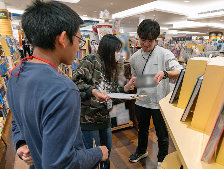 今回のブックハンティングでは、学生が実際の書店で本を手に取りながら、「大学に置きたい本」「仲間に読んでほしい本」を自由に選びました。選ばれた書籍は図書館の蔵書となり、江戸川大学の全学生が利用できます。