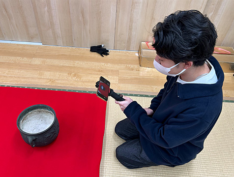 今回のフィールドワークでは、河内町内に所在する石碑・石造文化財および河内町歴史民俗資料室収蔵の民俗資料を対象に、スマートフォンによる三次元計測を実施し、アプリケーションソフトの性能評価とより良い計測技法の検討を行いました。