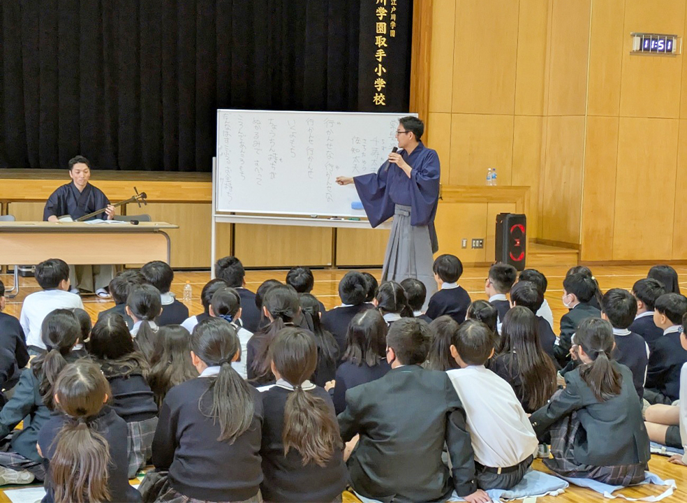 常磐津佐知太夫氏が常磐津千寿太夫氏とともに常磐津節を実演した後、児童は「行かんせな」を吟じ、自分たちの身近なテーマ「最近食べた美味しいもの」で「行かんせな」の替え歌を作詞しました。授業の最後には、希望者が前に出て、自分で作詞した替え歌を常磐津佐知太夫氏に吟じてもらいました。初めて体験する三味線音楽に児童は夢中になり、「非常に楽しかった」「これからも三味線音楽をやってみたい」と古典芸能に対して親しみを覚えた感想が寄せられました。