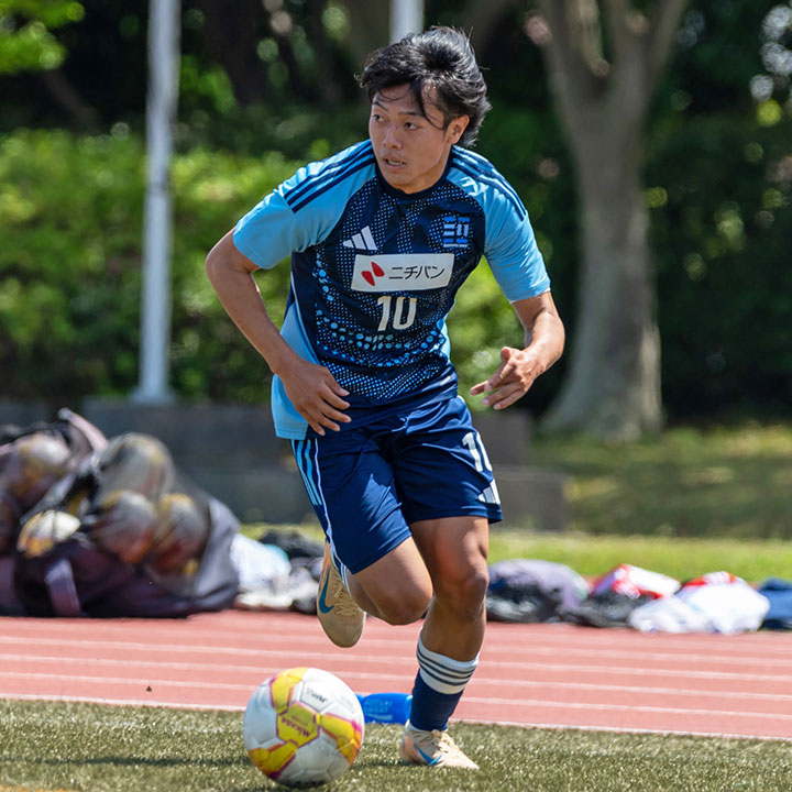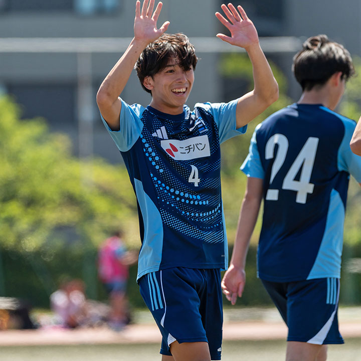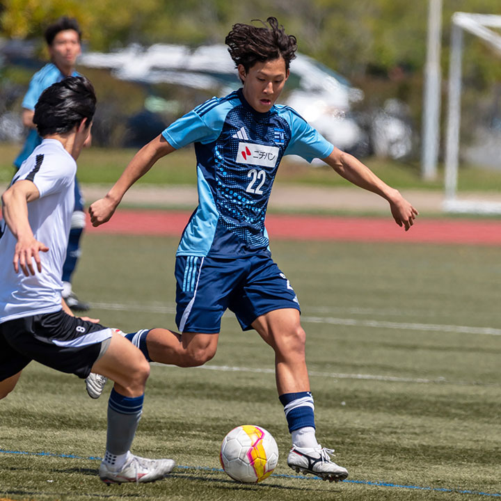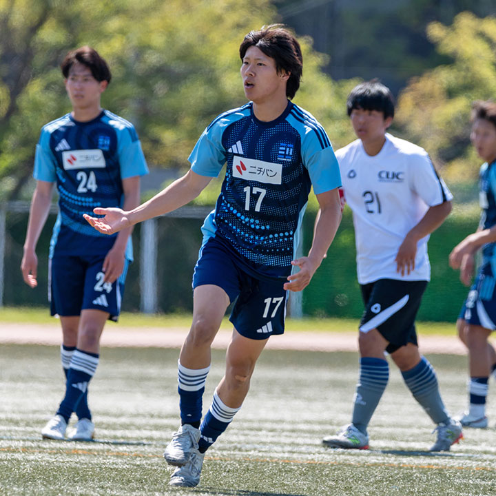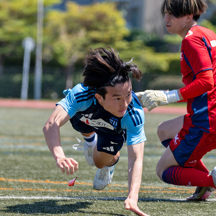 前半26分、千葉商科大学のロングスローへの対応を誤り、先制点を奪われてしまいます。しかし36分、安達朔(経営社会学科2年・札幌西陵高/北海道コンサドーレ札幌U-18)がゴール前に果敢に飛び込み、ヘディングシュートを決めて同点に追いつきます。