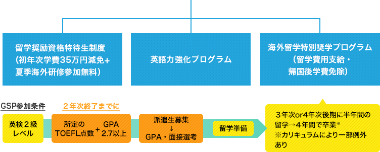 グローバル・スタディ・プログラム(GSP)参加者限定の充実した奨学金制度は、以下の3つの支援制度から構成されています。