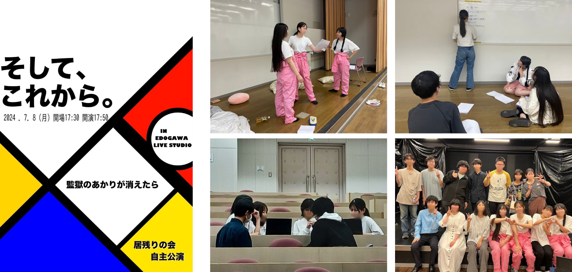 こんにちは。我々居残りの会は、「人間学総合基礎演習」で行われていた演劇公演が無くなったことにより発足しました。年二回の定期公演と外部での公演に向けて、基礎練習(発声、活舌、エチュードなど)や裏方準備(脚本制作、照明、音響、舞台美術)などを行っています。私たちと一緒に、楽しく真剣に演劇に取り組んでくださる方を募集しています!役者のみ、裏方のみも大歓迎です!興味のある方は、お気軽にご連絡下さい。