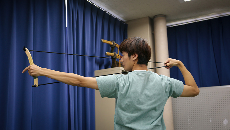弓道愛好会では、伝統文化「弓道」を通じて心と体を鍛え、仲間と楽しく活動しています。大学には弓道場がありませんが、教室でのゴム弓練習や巻藁ネットを使った室内練習を行い、初心者でも安心して始められます。さらに、道場がない環境でも安全に弓を引けるよう、現在は巻藁ネットを活用した練習セットを製作中です!